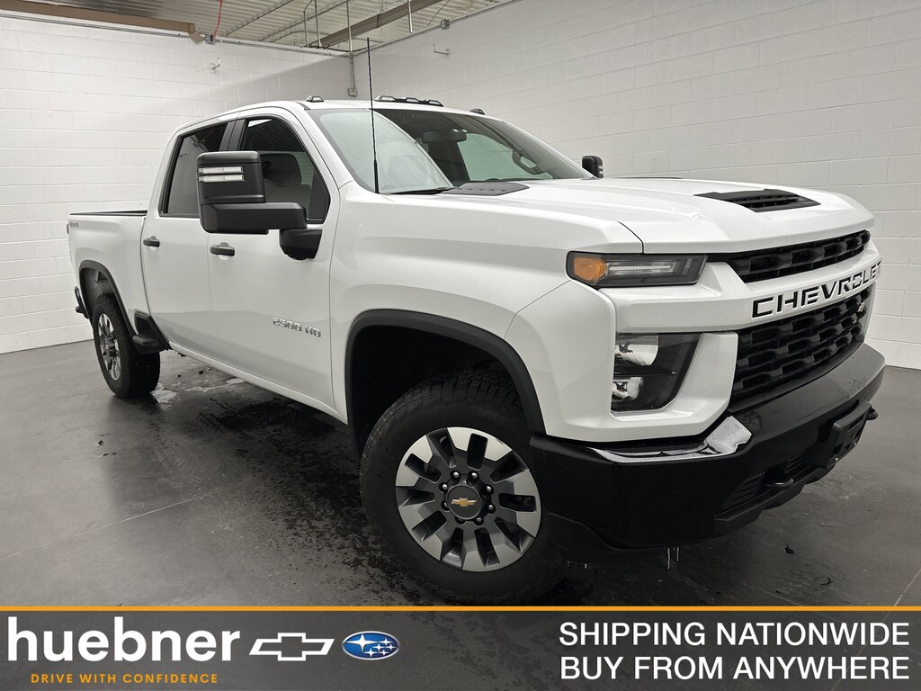 On the exterior, this 2500HD Custom stands out with 20-inch machined aluminum wheels, all-terrain LT275/65R20 tires, Black high-gloss front and rear bumpers, and a body-color grille with black mesh inserts. The Durabed is ready for real work with 12 fixed tie-downs rated at 500 lbs per corner, bed rail protection caps, LED lighting, and a ChevyTec spray-on bedliner. The EZ-Lift tailgate with power lock and release adds convenience, while roof marker lamps and power-adjustable heated trailering mirrors with integrated turn signals increase confidence during early morning hauls and nighttime towing.