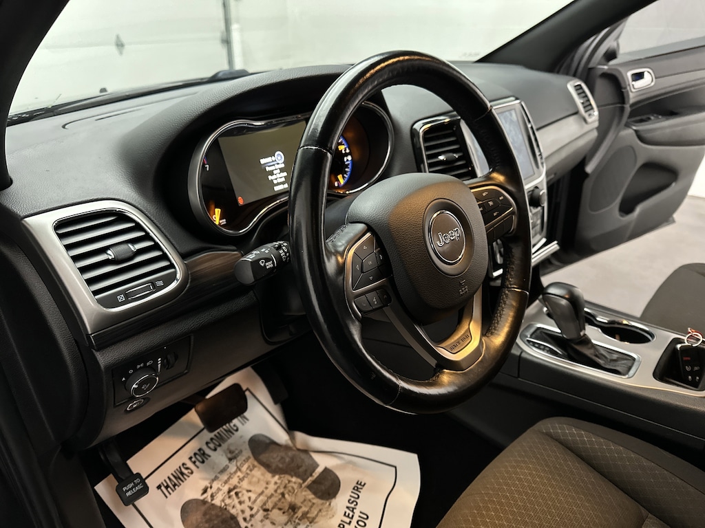 The 2021 Grand Cherokee Laredo is where comfort meets confidence. From the moment you settle into the supportive cloth bucket seats, youâll feel surrounded by quality and purpose. The cabinâs thoughtful layout blends modern tech with Jeepâs signature toughnessâ"woodgrain accents, soft-touch materials, and a leather-wrapped steering wheel create an inviting atmosphere, while the elevated driving position and commanding hoodline remind you this is a vehicle built for real adventures.